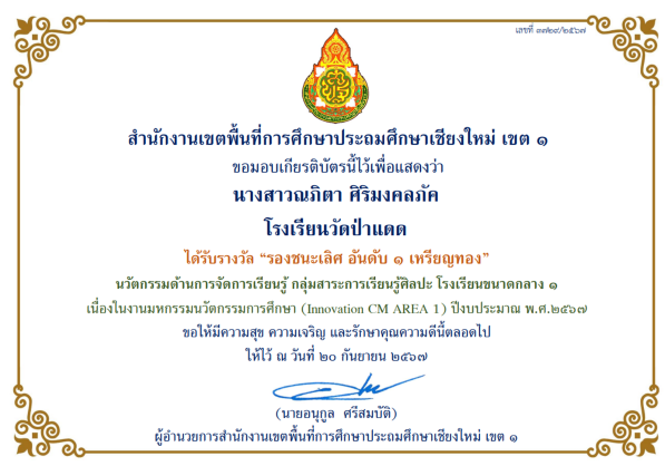 ชื่อผลงาน : รางวัลนวัตกรรมการจัดการเเรียนรู้ กลุ่มสาระการเรียนรู้ศิลปะ ในงานมหกรรมนวัตกรรมการศึกษา ปีงบประมาณ 2567 สำนักงานเขตพื้นที่การศึกษาประถมศึกษาเชียงใหม่ เขต 1